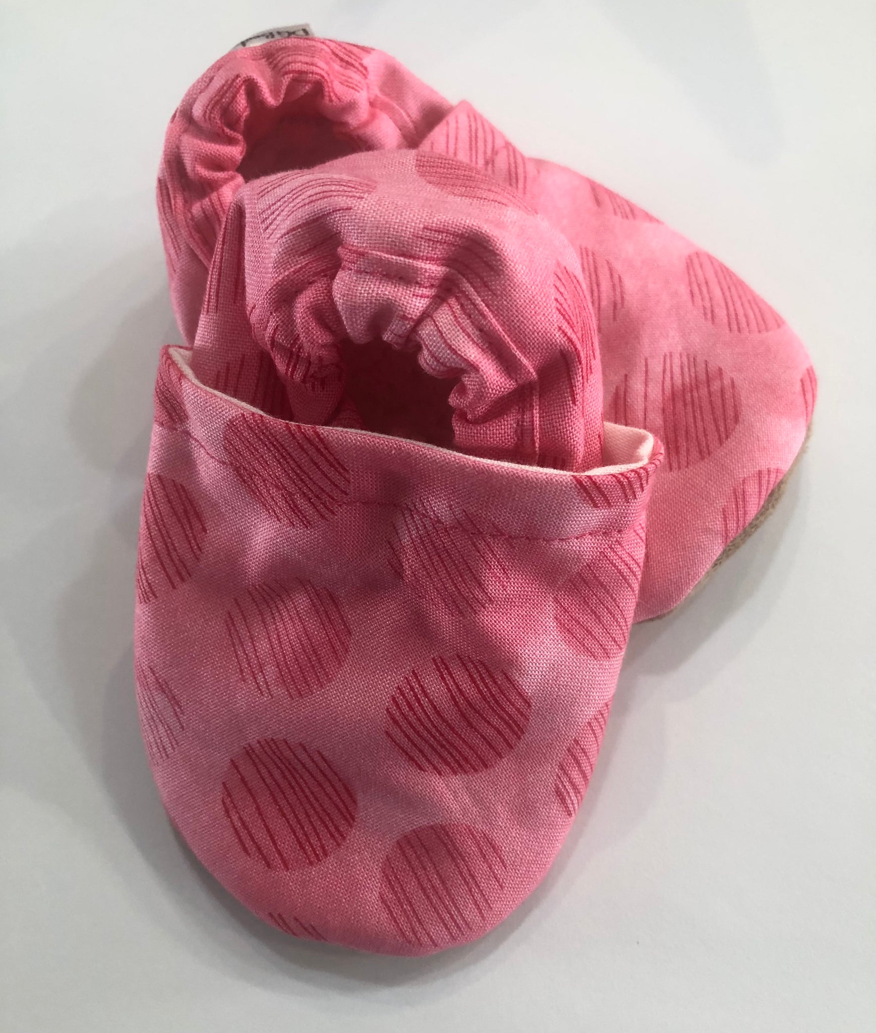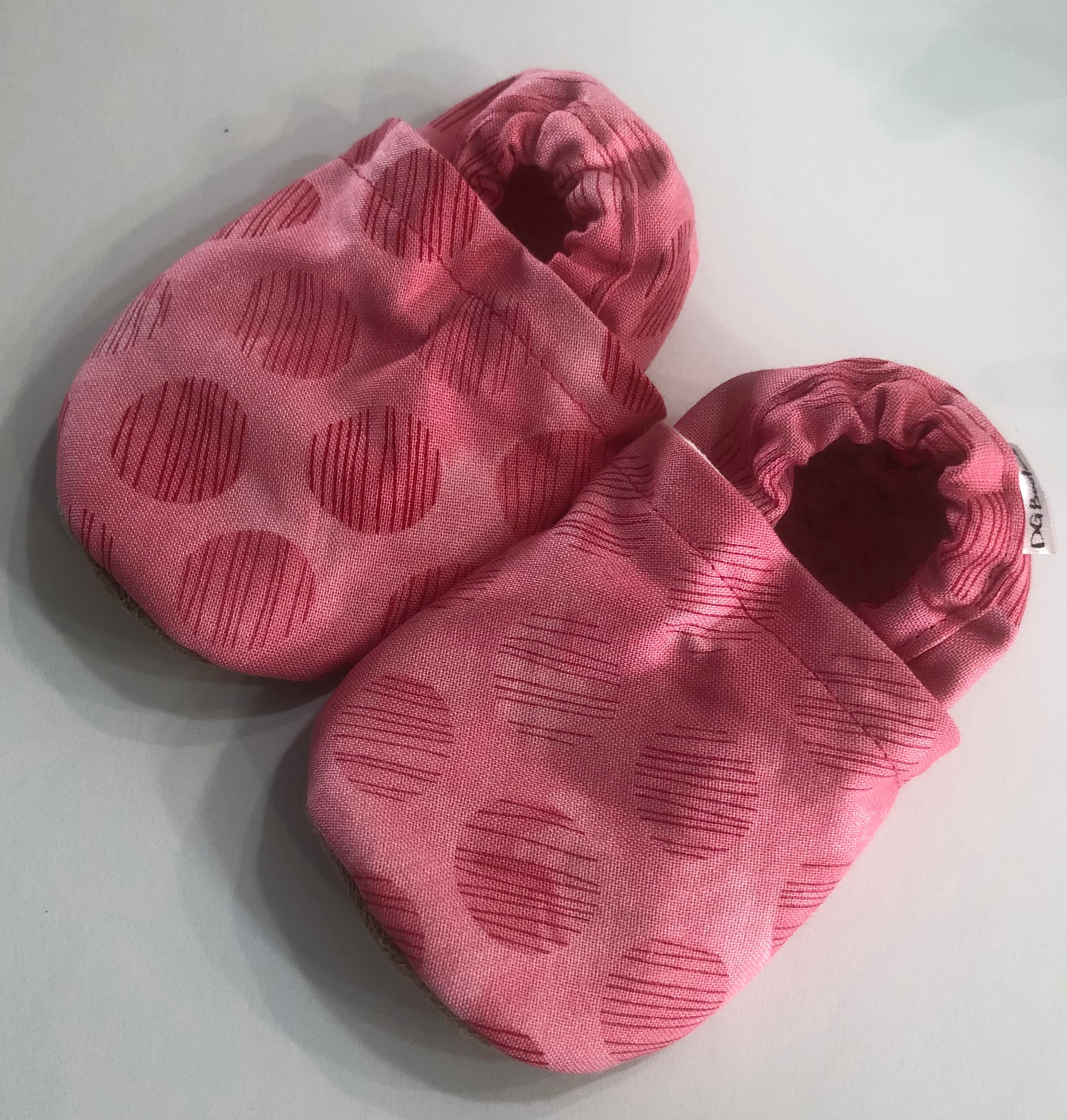 Booties are made with 100% cotton fabric and 100% polyester bottom. The inner sole is made using Sherpa fleece. The outer sole of the shoe is made using a faux suede.