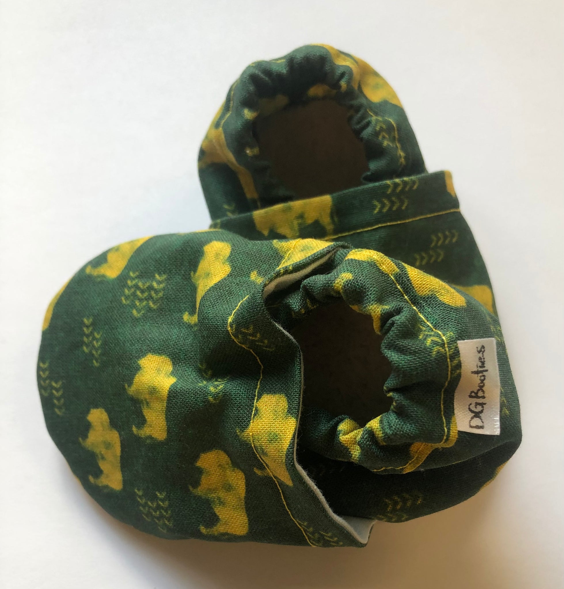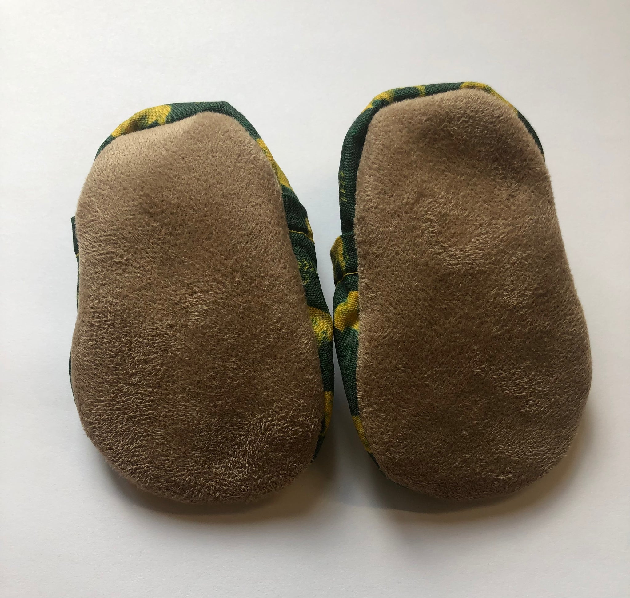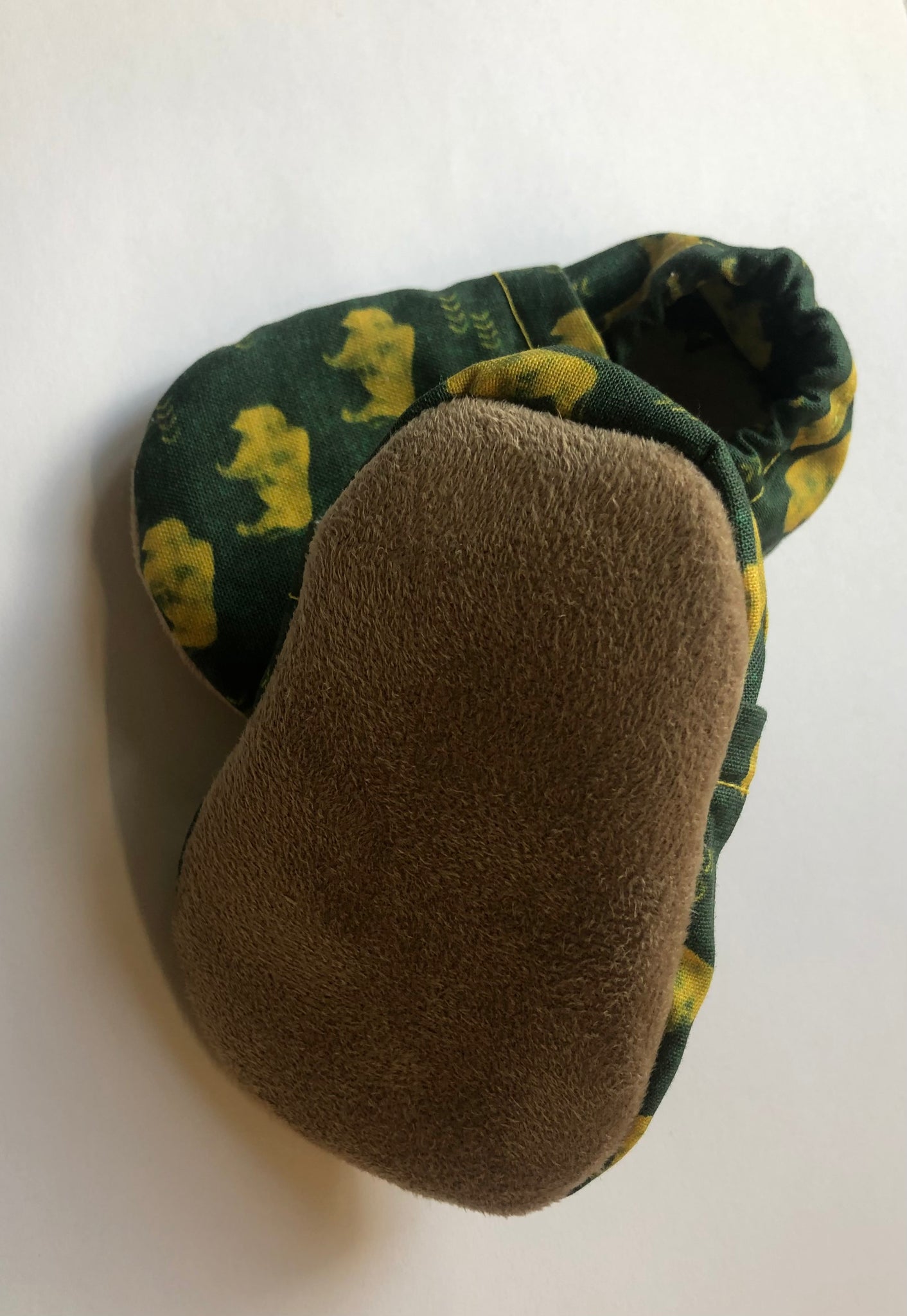 Booties are made with 100% cotton fabric and 100% polyester bottom. The inner sole is made using Sherpa fleece. The outer sole of the shoe is made using a faux suede.