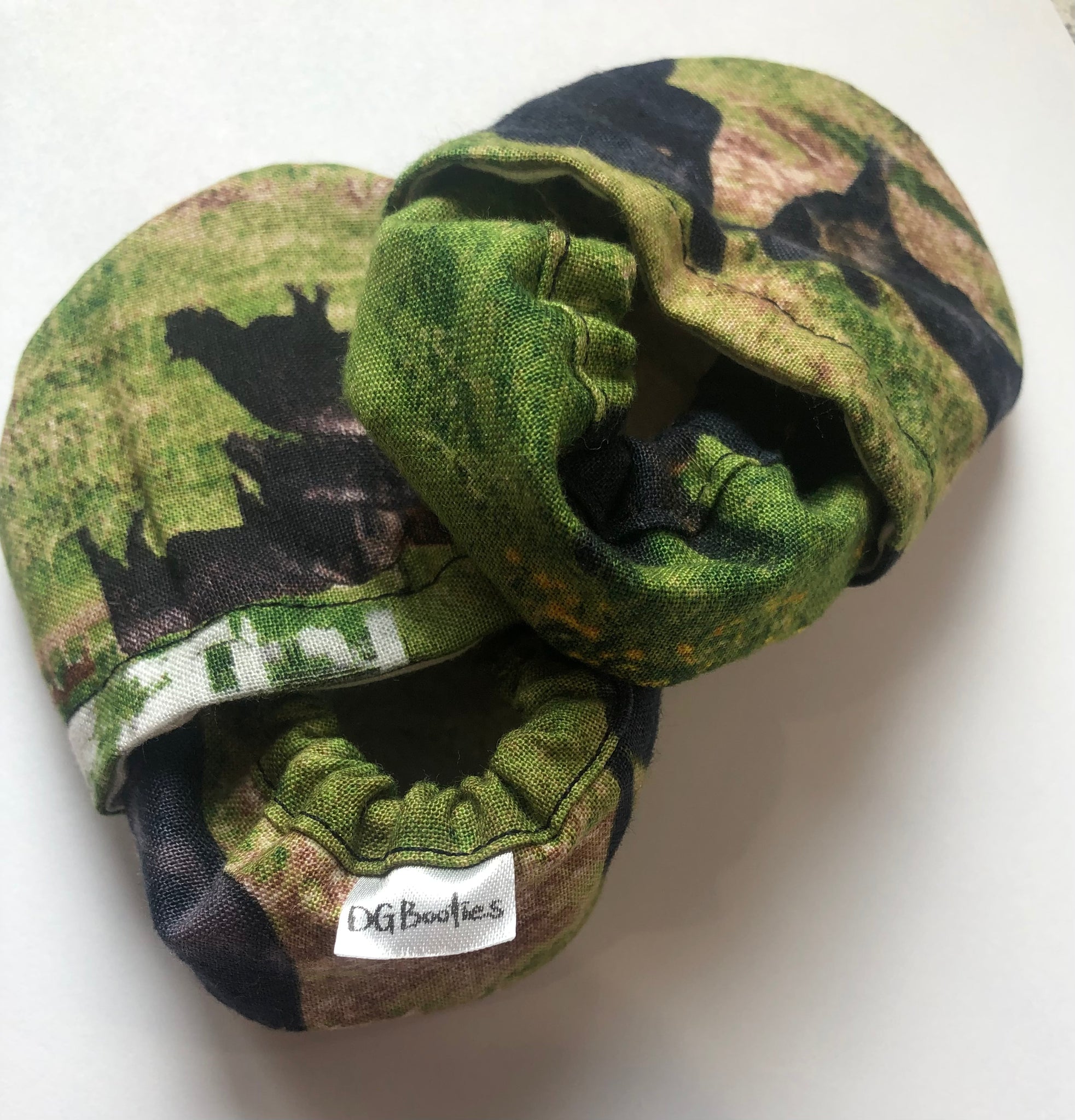 Booties are made with 100% cotton fabric and 100% polyester bottom. The inner sole is made using Sherpa fleece. The outer sole of the shoe is made using a faux suede.