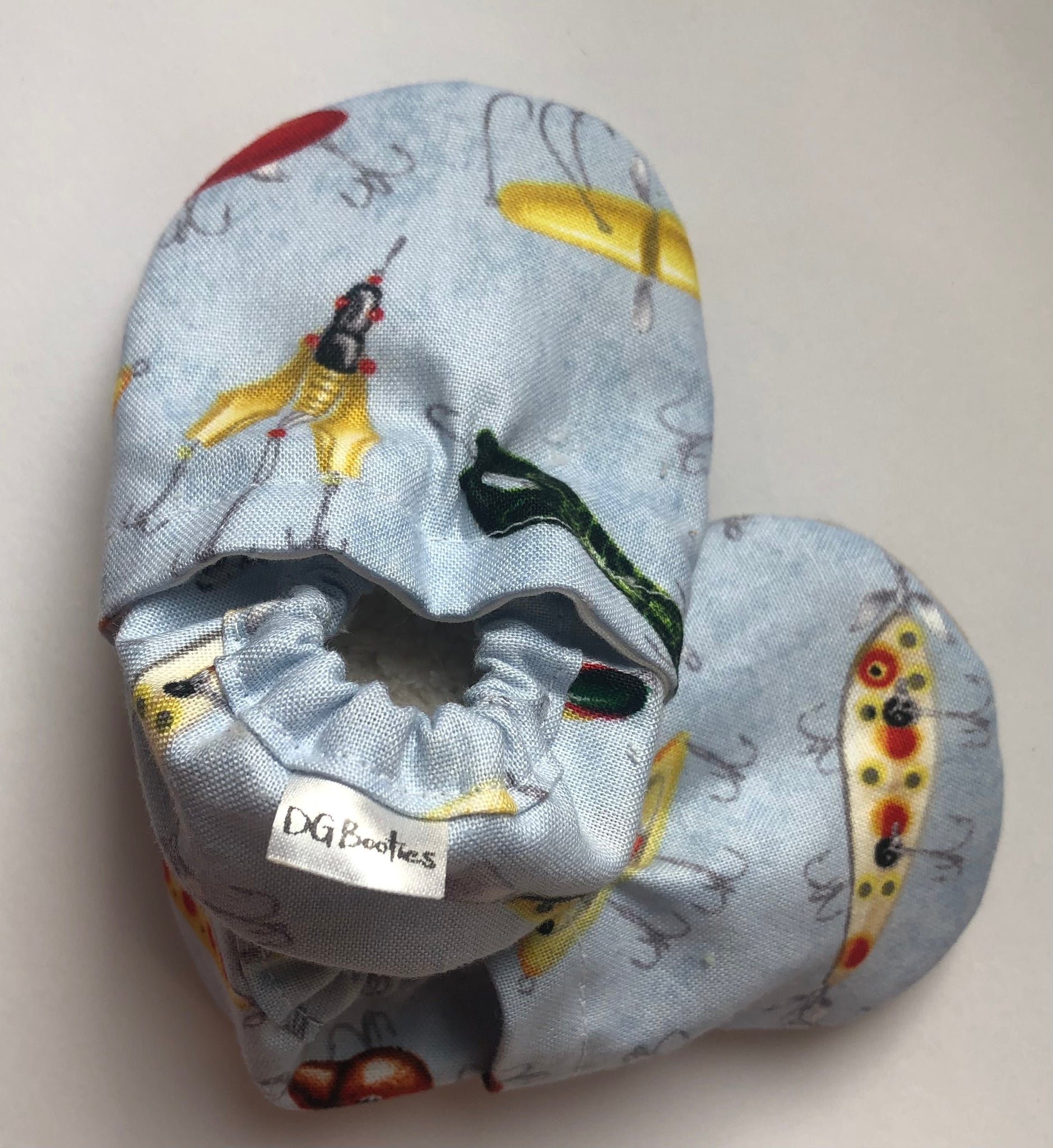 Booties are made with 100% cotton fabric and 100% polyester bottom. The inner sole is made using Sherpa fleece. The outer sole of the shoe is made using a faux suede.