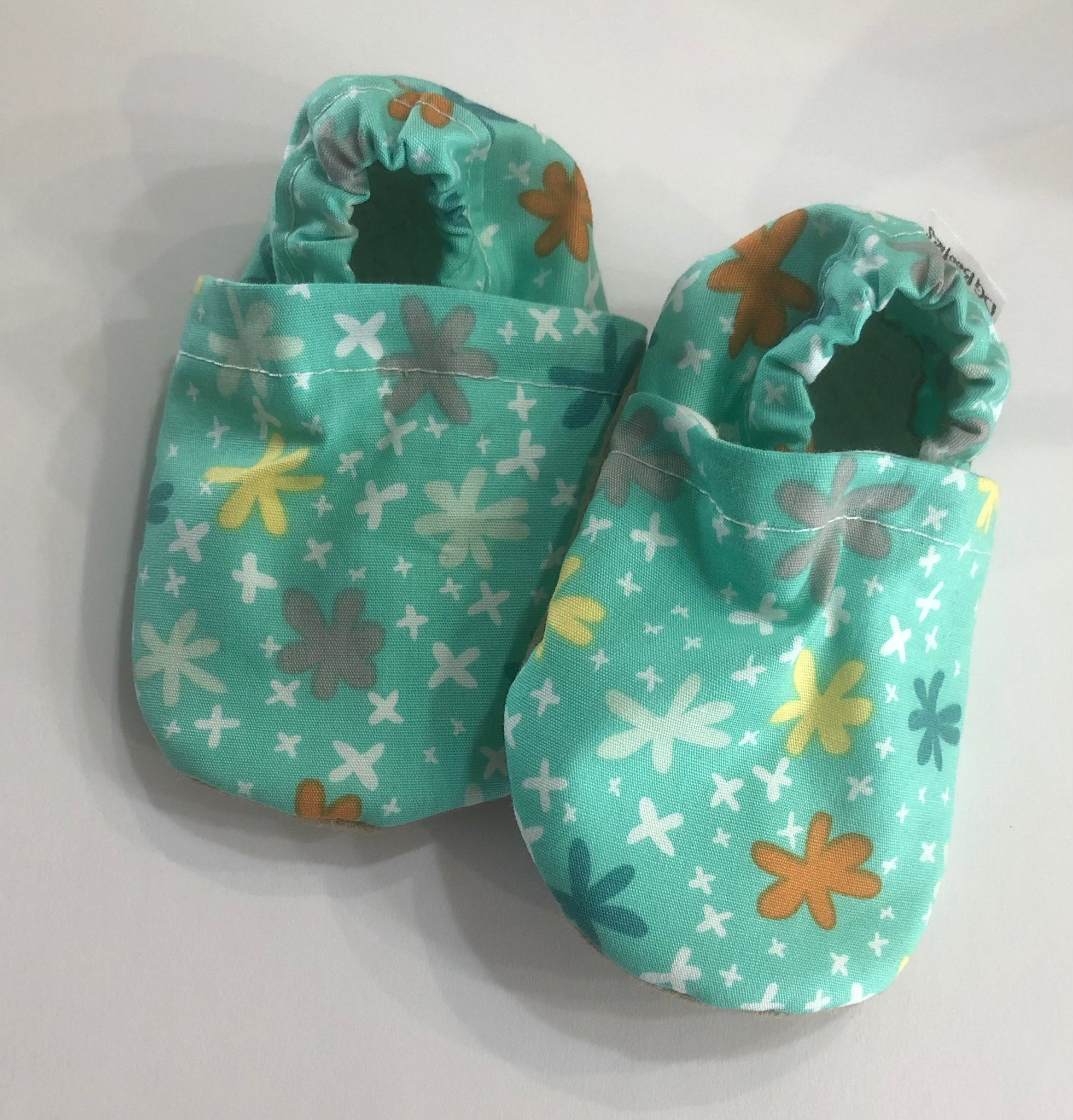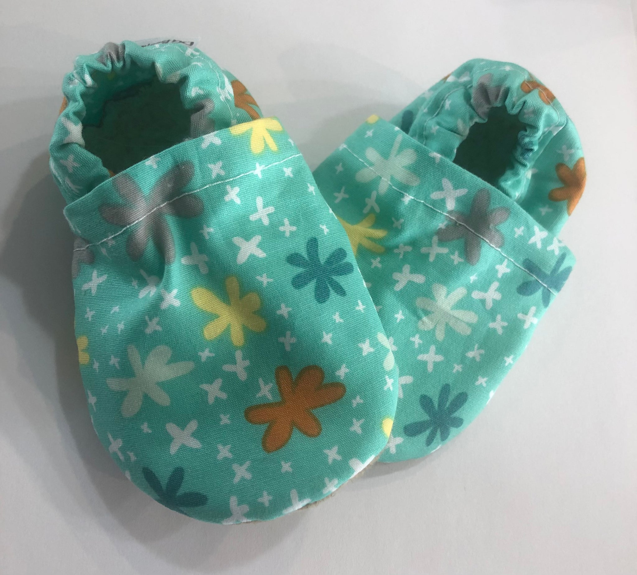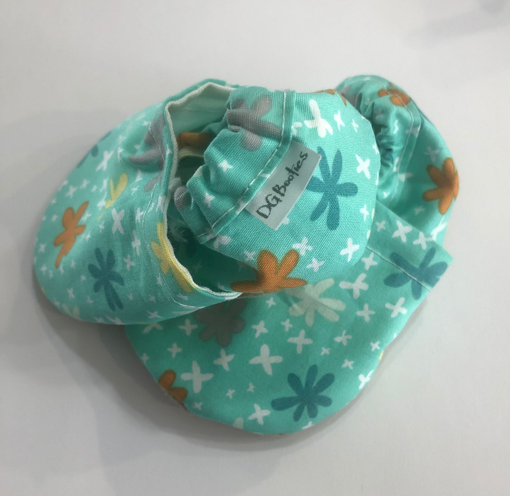 Booties are made with 100% cotton fabric and 100% polyester bottom. The inner sole is made using Sherpa fleece. The outer sole of the shoe is made using a faux suede.