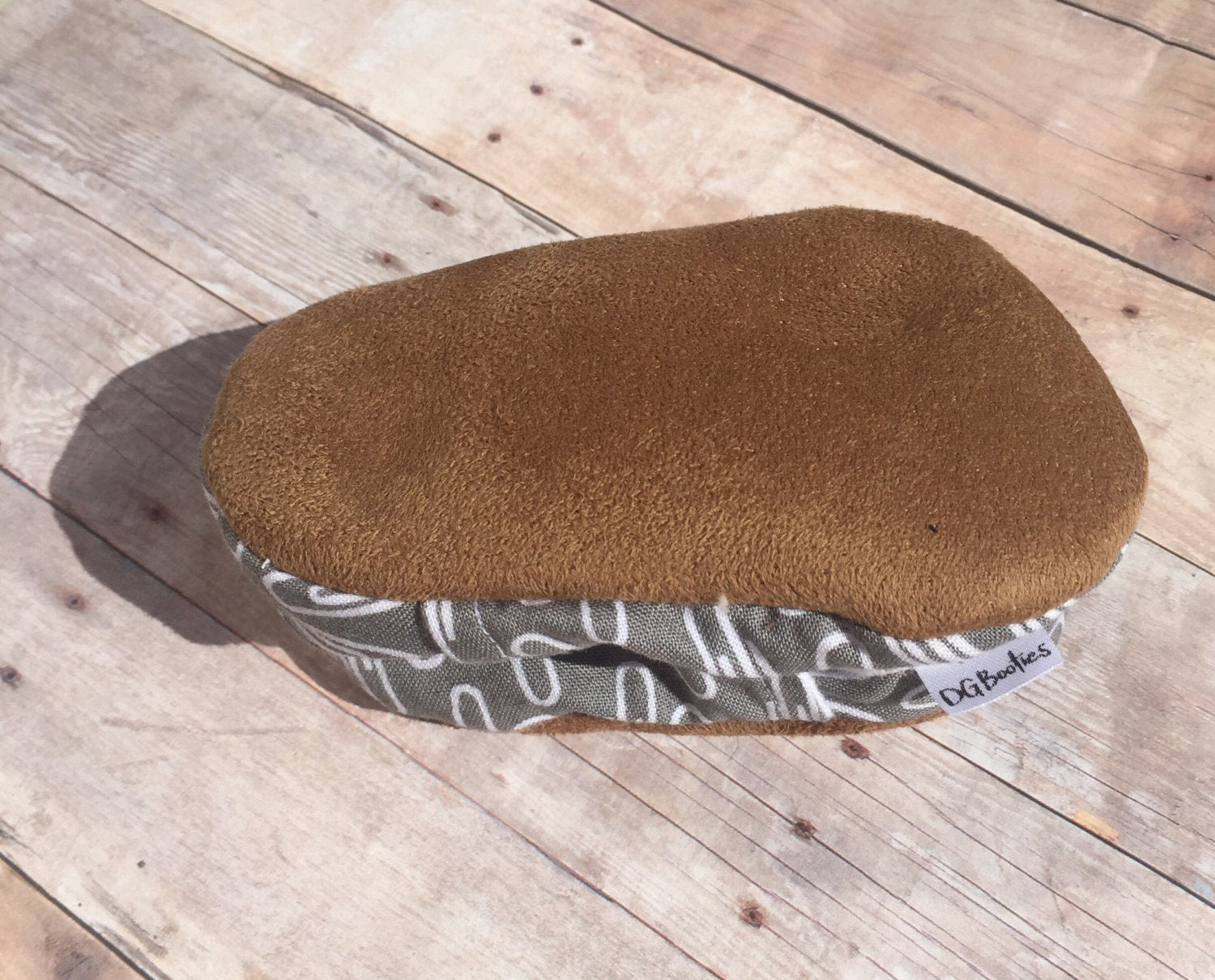 Booties are made with 100% cotton fabric and coordinating flannel as the accent color. The inner sole is made using Sherpa fleece. The outer sole of the shoe is made using a faux suede.