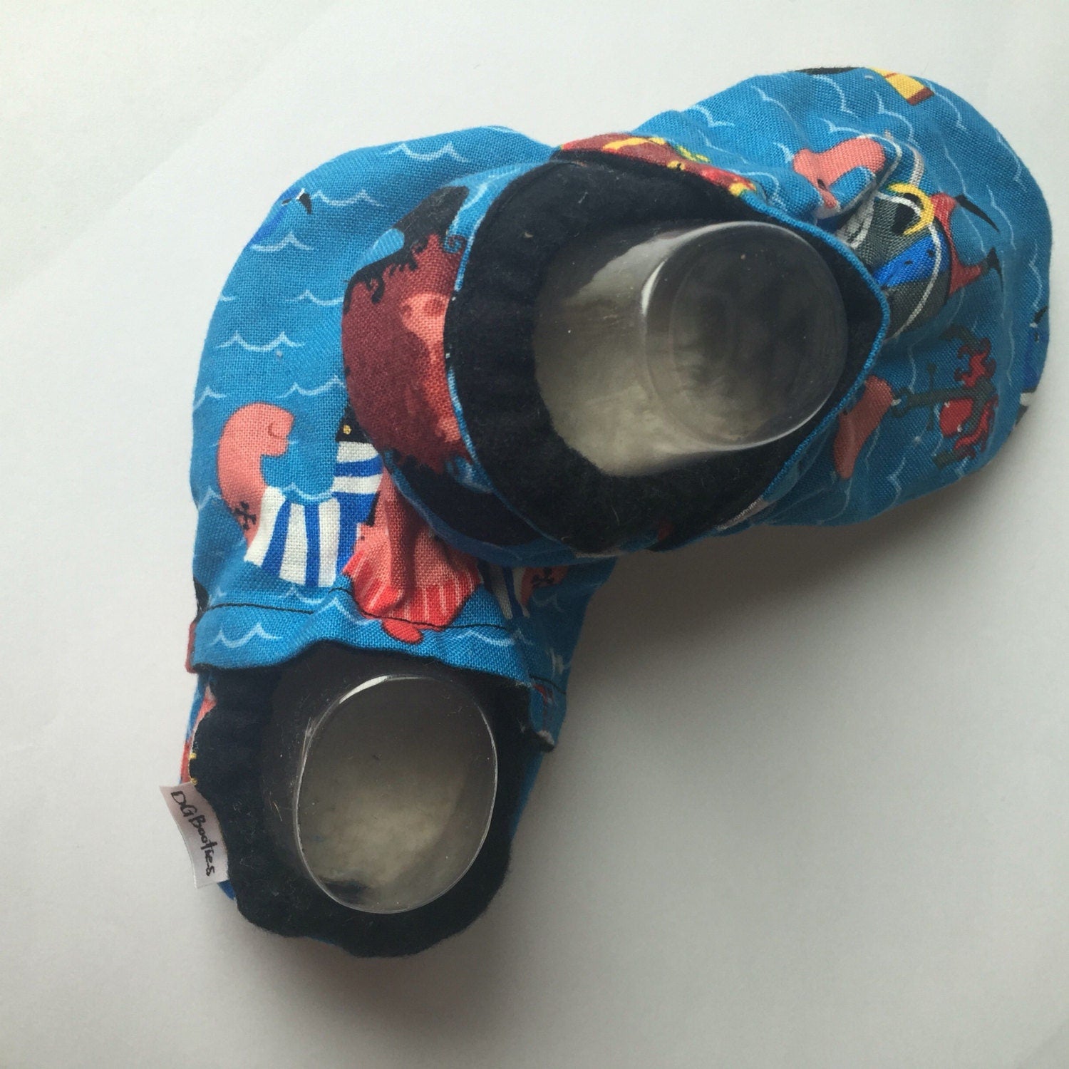 Booties are made with 100% cotton fabric and coordinating flannel as the accent color. The inner sole is made using Sherpa fleece. The outer sole of the shoe is made using a faux suede.